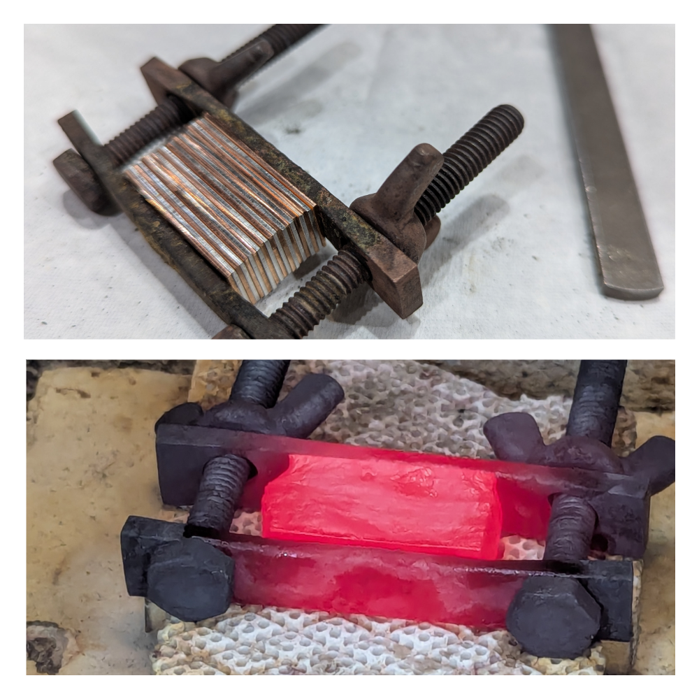 この後には赤みのある高温の金属を金槌で叩き圧着させる工程があります。