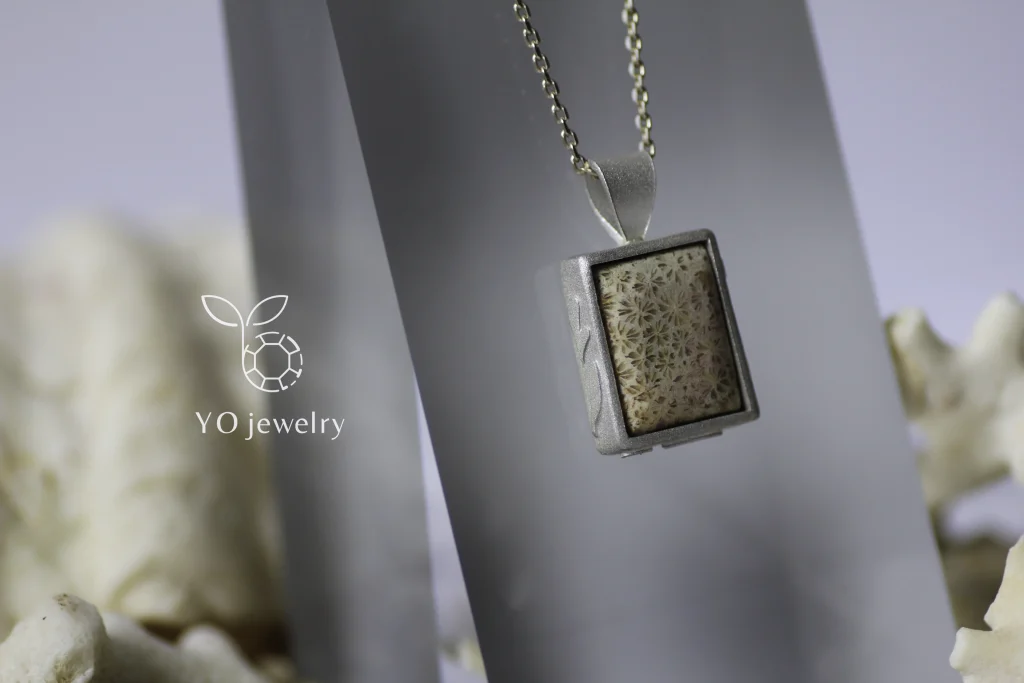 今回作った一点物のフォッシルコーラルのペンダント。仕入れの際にお伺いした話では、台湾の市場で手に入れたものだとおっしゃっていました。
