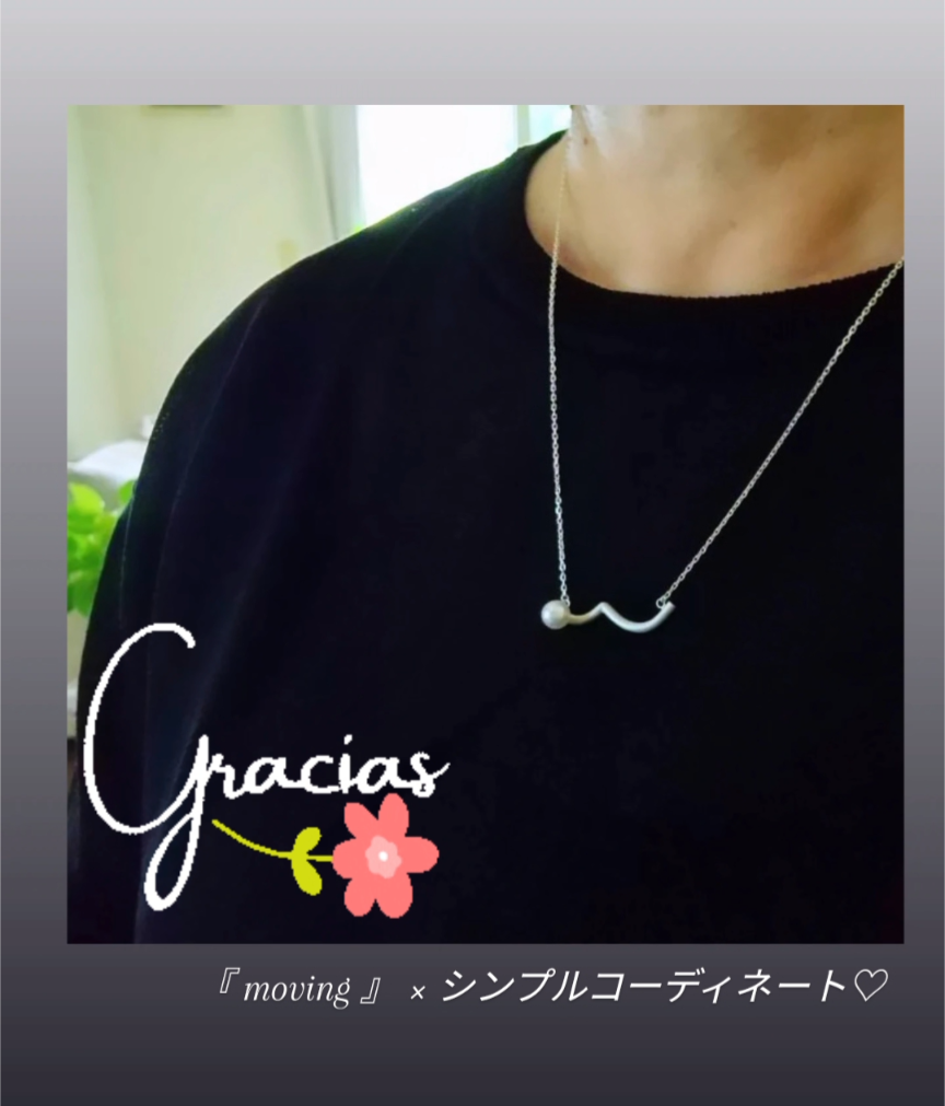 先日、実際に身に着けた写真を送ってくださいました!シンプルなお洋服にアシンメトリーなネックレスがワンポイントとして映える素敵なコーディネートです。