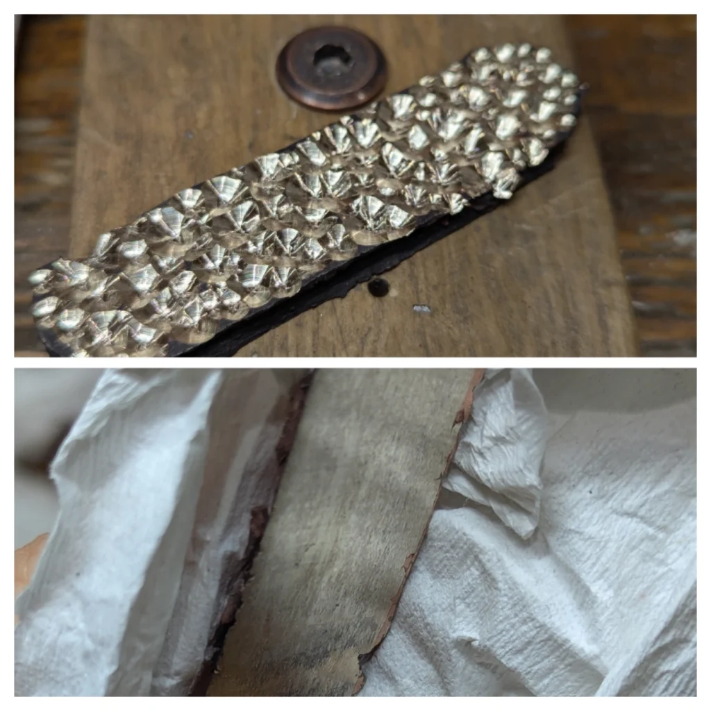 作った地金に凹凸や捻れをつくることで、独特の模様を作っていく工程です。必死に1mmまで延ばしたものの、思いのほか模様が薄く…?!