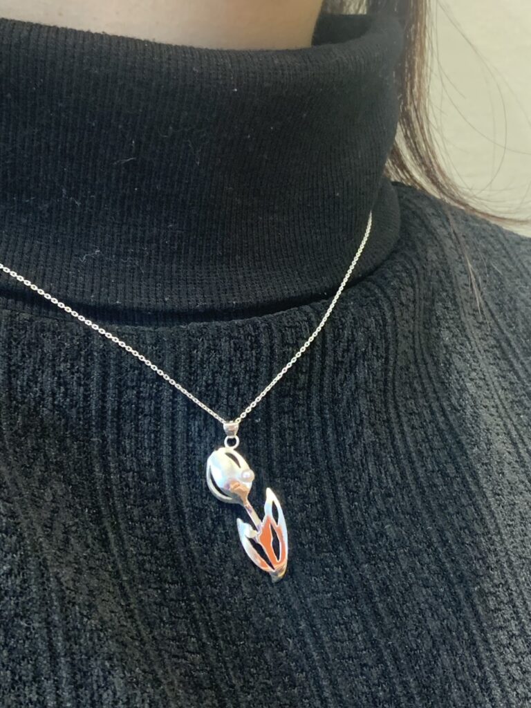 こちらのチェーンの長さは50cm、男女共に冬服でもゆったりと着けられるサイズ感です。